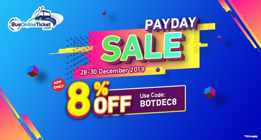 During this Payday Sale, every mobile app users can enjoy up to 8% OFF on any bus ticket bookings via BusOnlineTicket Mobile App starting from 28/12/2019 to 30/12/2019. Use the discount code BOTDEC8 to enjoy the special offer of 8% OFF discount with maximum capped at RM5 or SGD5, whichever lower on any bus ticket bookings. The discount will be applied automatically once you key-in and submit the discount code on BusOnlineTicket Mobile App payment page.
