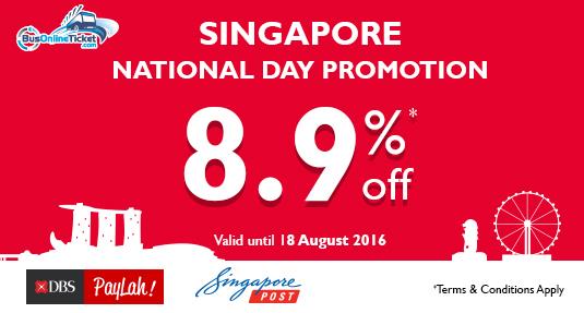 Make this Notional Day be more meaningful to our valued customers, BusOnlineTicket is giving up to 8.9% discount for any bus ticket booking via SingPost and DBS PayLah! at our portal till 18th August 2016.