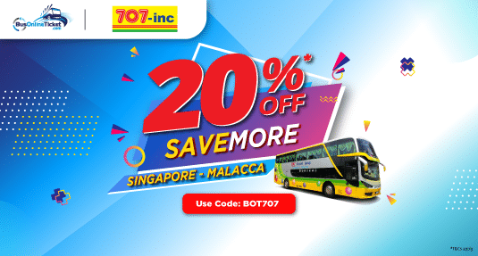 Book 707-Inc bus ticket online at BusOnlineTicket.com and enjoy 20% OFF for bus from Singapore to Malacca and bus from Malacca to Singapore from 1st October 2019 to 6th October 2019! Use the discount code BOT707 in payment page before proceeding to payment and enjoy the 20% discount on your ticket price. So, book your tickets and reserve your seats online now!
