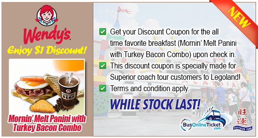 Get your $1 discount coupon of Wendy’s all-time favorite breakfast (Morning Melt Panini with Turkey Bacon Combo) with your Superior Tour bus ticket to LEGOLAND® Malaysia!